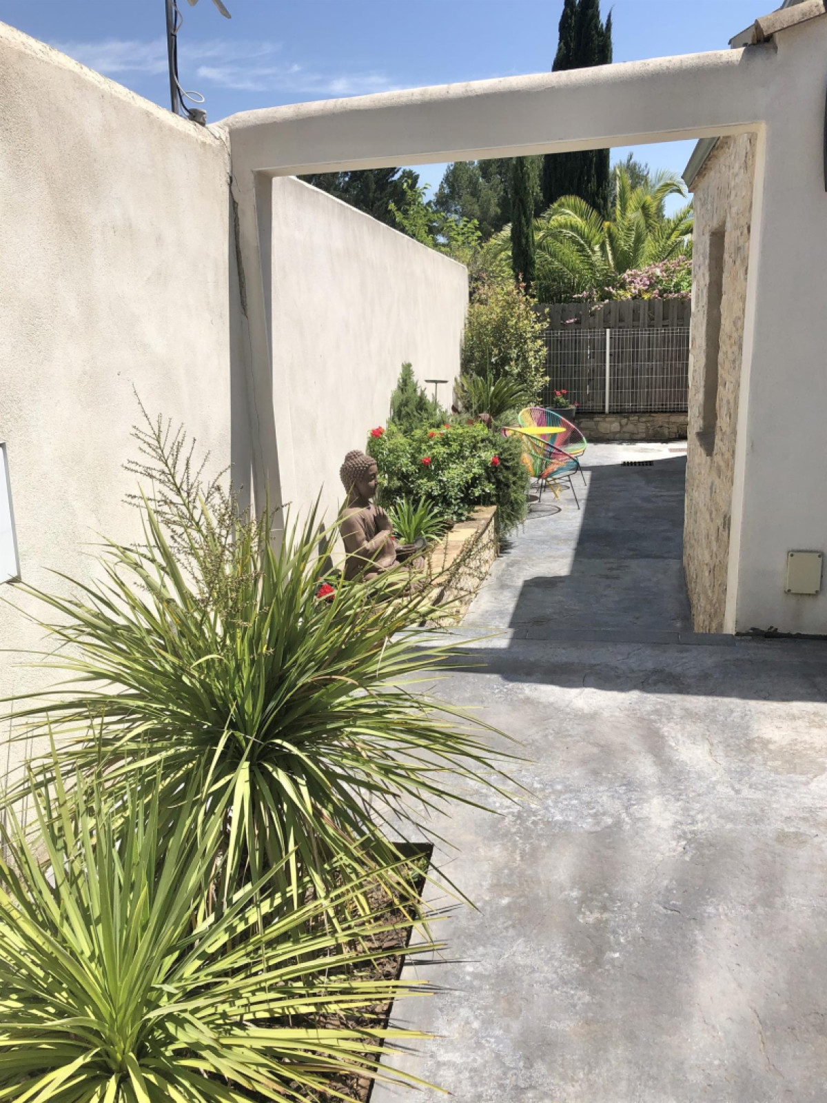 L'extérieur comprend une cour avec place de parking sécurisée, une vaste terrasse abritée par une paillotte avec salon de jardin et barbecue.